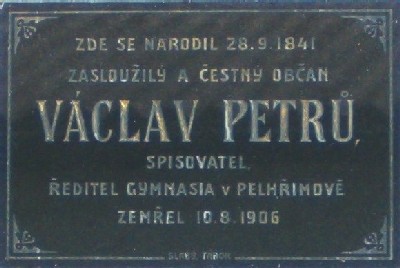Nyní se ve vyprávění vraťme od počátku našeho století zpět do doby kolem poloviny století minulého - devatenáctého. Dne 28. září 1841 došlo v Klenovicích k události, jejíž význam si v těch chvílích samozřejmě nikdo neuvědomoval. Toho dne se tu totiž narodil v domě číslo 36 Václav Petrů, o němž jsme již mluvili na straně 16 a jehož pamětní deska vsazená do průčelí rodného domu ho trochu nadsazeně nazývá spisovatelem. I když na druhé straně je pravda, že jmenovaný byl autorem mnoha knih, publikací i časopiseckých a novinových článků. Zabýval se především historií, literaturou a v tomto oboru byl autorem nejedné pedagogické a didaktické práce. Z rozsáhlejších děl Václava Petrů, působícího po dobu třiceti čtyř roků ve funkci ředitele gymnázia v Pelhřimově, uveďme aspoň těchto několik: Dějiny města Pelhřimova, Ilustrované dějiny literatury povšechné, Poetická čítanka, Čítanka pro nižší třídy škol středních, Obrazy ze života starověkých národů, Anthologie epických básní původních a přeložených, byl spoluautorem čítanek pro školy měšťanské.
